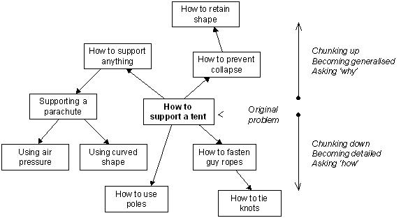 The brain understands things in distinct chunks (see Chapter 8), building large chunks out of smaller chunks. Thus a tree is made from leaves, twigs and branches. We can use this principle of hierarchical analysis to understand many inventive situations. The simplest method of chunking is to break things down into their individual parts, thus a keyboard may be broken down into keys, casing and connector, with the connector breaking down into sheath, screw, and pin assembly, and so on. The inventive eye can then be focused on very specific aspects, such as the force required to push the pins into the sockets or the ease with which the connector casing can be grasped. We can also chunk up, looking at the big picture. This is particularly useful in the early stages of invention when you are asking questions like, ‘what is the real problem here?’ As you chunk up further, you will get to more general, broader areas. You can also then chunk back down through different branches to discover new areas of focus. For example, in Fig. 1.1, we chunk up from supporting a tent to the general problem of support, and then back down to specific alternative ways of providing support. A trick of chunking is in the questions you ask as you chunk up or down. By changing the questions, you will discover different things. A simple alternative is shown in Fig.1.1, where you chunk down by asking ‘how’ and chunk up by asking ‘why’. You could also ask ‘What is the benefit of doing this?’ to chunk down, and ‘What problems are solved by doing this?’ to chunk up.