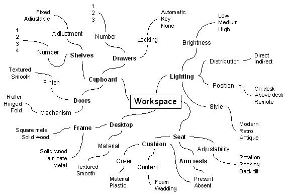 If you are looking at a chair and have chunked down to the legs, the next level of detail may be found by examining the attributes of the chair legs. These may include simple, measurable factors such as length, thickness and density. More complex attributes may also be considered, such as shape, connection method and load-bearing characteristics. You could even look at the aesthetic attributes, including texture, colour and attractiveness. When you have identified attributes of interest, you can then find the values that the attributes can have, and then decide how you might change these. Some can be changed continuously, such as the thickness of a chair leg, whilst others are changed in discrete chunks, such as the use of either hardwood or metal for the legs. When you are inventing for a particular marketplace, Attribute Analysis can be used in combination with other techniques, such as Customer Needs Analysis, to discover which attributes are particularly important (and hence where people would be prepared pay more). Fig 1.2 shows how you can break down a problem area into parts, attributes and potential values which you can then change.