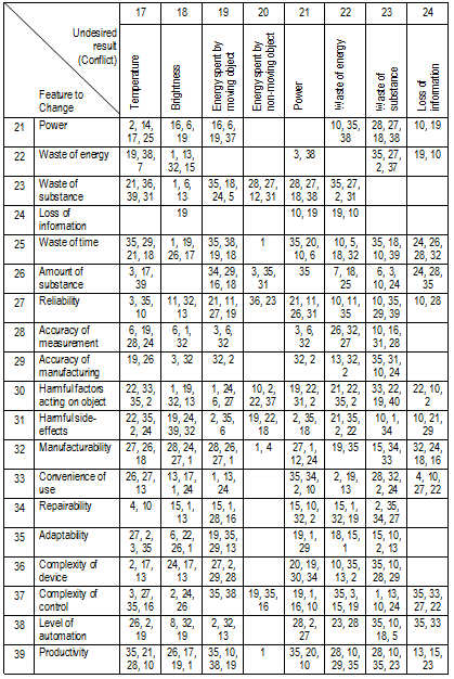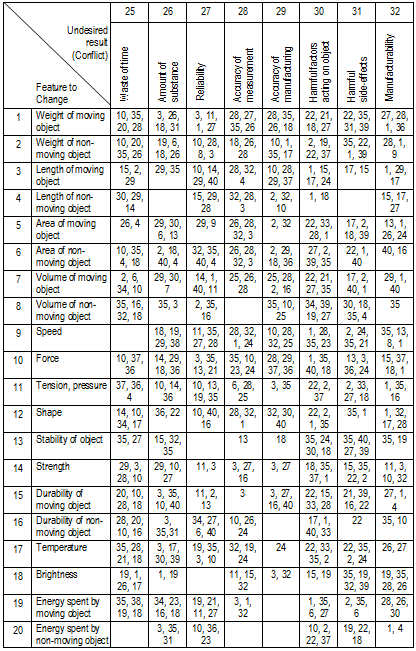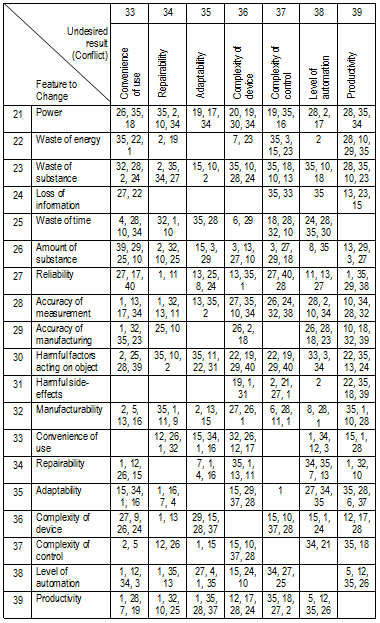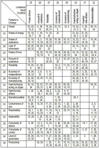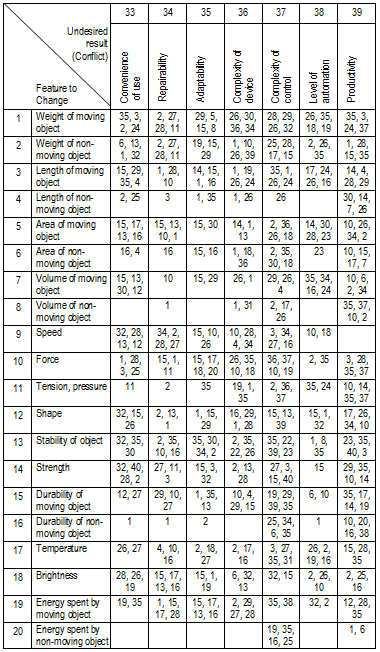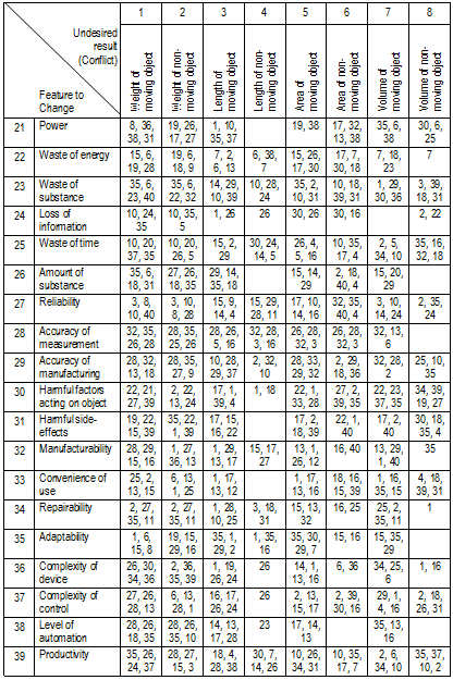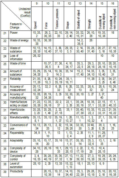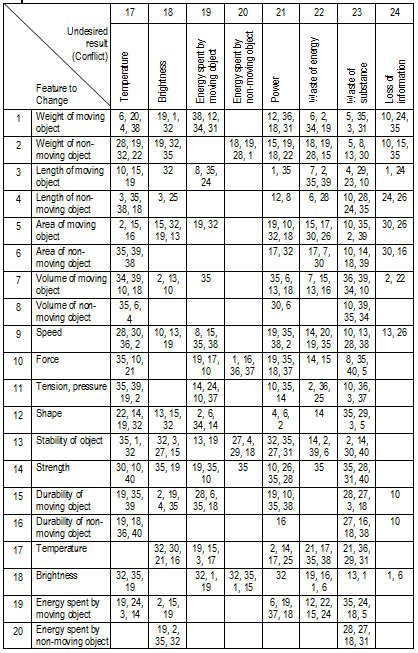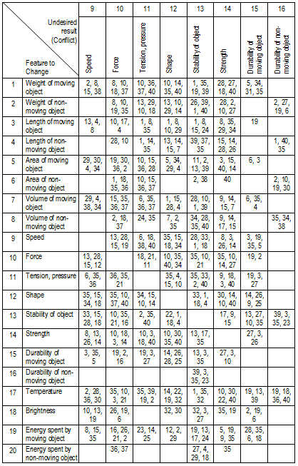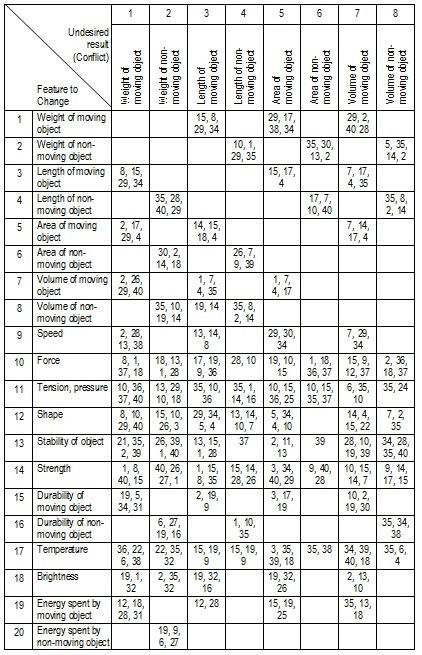 Contradiction MatrixNormally, the Contradiction Matrix is a 39x39 grid. This can be rather awkward to use, so the table is reproduced here as a series of sub-tables. Just find the table with the right contradiction number for row (feature to change) and column (undesired result). Here is a short-cut table to help you get to the part of the contradiction table that you need.