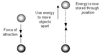 We can also store energy by position, such as the potential energy gained when I put a can on a shelf. Energy can be stored as a potential where there are fundamental forces that attract or repel objects, as in Figure 2.2.. The attraction that holds the can on the shelf is, of course, between the earth and the can. The energy is stored in the distortion of the gravitational field. This ‘potential’ stored energy can be found in batteries, springs, capacitors, balloons, fluorescent displays and many other devices. It is one of the amazing things about nature that the same patterns and even mathematical formulae appear across many different physical domains.