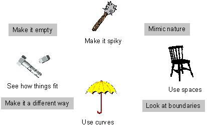 Fig. 2.11 Inventing in space Many, many, many inventions are simply about changing the shape of things to make them do what they do better. Although the basic idea may be to change the shape, the critical part of the invention may well be in the manufacturing process, such as in new milling methods and tools to cut shapes more accurately. The ongoing improvements in robotics, use of materials and other manufacturing system all give opportunities to make things differently or more cheaply and thus add greater value to the finished product. If, when examining an item, you already have the best shape, you can still invent by asking yourself whether, if it was a different shape, it could be used for additional functions. For example, you could shape the end of a key to be like a screwdriver blade. This might result in the problem of the key cutting holes in your pocket, but rather than reject the whole idea this simply becomes the next target for innovation. Play with space. Look at it as negative matter: how do the spaces between the shapes alter things? Create virtual space using glass or other transparent and translucent materials. Change the shape of the space and the space around the shape. Move around the space: how do things appear from different perspectives? Zoom in and out, up and down, around and within. See it from your customers’ viewpoint: what does space mean to them? If you are designing books or websites, look at the balance of white space to text and pictures. Make nothing a tool in your invention kit.