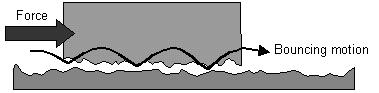 Think of a heavy supermarket trolley going over rough concrete. Although the wheels help you move it, the trolley still has to rise and fall over the bumps, and the size and shape of the bumps will change how much force you need overall to move the trolley forwards. Now zoom into the microscopic view of a block of wood being pushed along a table (Fig. 3.1). The same thing is happening! The molecules from the wood and the table are snagging against one another making the wood bounce imperceptibly on its way. With a larger, heavier block of wood, you might be able to feel the juddering. All surfaces have some bumps, unless they are so fine they have one nearly smooth layer of atoms (and then other factors, such as electrostatic forces, are important). So a way of reducing friction is to smooth out the bumps. Oil partly works this way, filling in the gaps between the bumps. Sometimes, you may want to increase the friction, such as when you need a rug to stay where it is and not slide across the floor. In either case, you may want to change the size and shape of the bumps or the effect they have, both on the thing that is being pushed and on the surface on which it is moving.