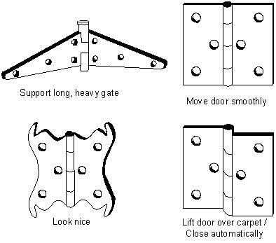 Fig. 4.1 Some functions of hinges Having identified what it is supposed to do, we now start the design stage, asking how it should be done. If you want a really radical design then you forget about how you do it now and explore the most abstract level of wish. You might start from the concept of a seal for the doorway which avoids obstacles and consequently invent a rail for the door to run along, with a concertina-type door, or nested sliding doors. We can think about the hinges in terms of the forces involved. In hanging the door, there is a shear force across the hinges. The door will try to pull out the top hinge, which must hence be well attached to the door frame, and push in the bottom hinge, which thus might be a lighter attachment. Other factors that involve forces were found in the discussion about function. These include the additional weight on the door, security implications and the forces of opening, closing, starting and stopping the door. The reality for most doors is that you have a lot of compromises. You find that someone fitting the door cannot get the hinges lined up perfectly as they are screwed maybe into wood and the wood gives way a bit so as the door is fitted it sags a bit. In practice, it works best if only one hinge carries the weight of the door. If two or more carry weight then the forces as the door swings tend to work against each other and it is difficult to open. The function of carrying weight tends to be best for the lowest hinge, with other hinges just holding the door neatly away from the frame. We can also consider the friction involved. As well as the friction in the hinge, we can consider the what is happening in the catch, or even the rubbing of the door against the carpet. Rising-butt hinges that lift as they open have already been invented. How about using electromagnetism in some way? How about creating charges on the carpet and the bottom of the door that repel one another, so the carpet flattens itself as the door opens? Or perhaps a similar charge on the leading edge of the door and an opposite charge on the trailing edge that lifts the pile of the carpet back up again (Wow: we have just invented a device for restoring old and tired carpets! This is how inventions sometimes happen–whilst you are inventing for one purpose, you discover something better for another domain). Notice how we are looking at the overall problem, not just the actual hinges. Let us return to the hinges themselves. The lower, weight-carrying hinge could use a small type of ball-race or ball and socket joint to carry the weight smoothly, reducing friction. The upper hinges can be of lighter construction as they are just holding the door in place. They may also have some vertical play in them as we do not want the hinges to fight one another. We can take inspiration from other places, including our good friend, Mother
