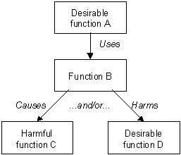 The heart of invention with TRIZ is the identification and resolution of contradictions. Indeed, Altshuller said that all inventive problems contain at least one contradiction. This changes inventing from ‘dreaming up ideas’ to finding and resolving contradictions, which is a far more structured approach. There are two types of contradiction: technical and physical. Fig. 5.2 shows the structure of a technical contradiction. A desirable function A uses a second function B which has undesirable effects, either causing a third function C which is harmful or harming an existing function D. For example, you can evenly spread light over a large car park by having a tall lamp post but this requires a high strength post to hold the large light far above the ground. A, (distant light source) needs B (tall strong post) which leads to C (high cost) and D (difficult maintenance).