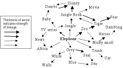 Think of elephants. Then watch where your mind goes, through other associations you have with the word. Do you recall trips as a child to the zoo? Or Walt Disney’s ‘Dumbo’ or various jokes? Memories can be related in many ways often from experiences, or through secondary links, such as when elephants remind me of tigers, because a tiger scared me soon after I saw my first elephant at a zoo. Fig. 7.7, where the thicker arrows represent more likely thought associations in the mental landscape, illustrates some of the effects of such networks. Likely thoughts may come from repetition, but these deep valleys can also be cut in a single slice by traumatic experience, such as the ‘elephant–zoo–tiger’ link. Thoughts may be deep hollows in which we can arrive from many directions, such as ‘Africa’. They may also be mountains, from which we can easily roll downhill in many directions, such as ‘grey’ (they can even be both at once!). Associations can be one-way or two-way, with a different thickness of arrow in each direction. The associations we have recently made may affect our choice of the next association, so ‘elephant–musty smell–horses’ may be likely but ‘zoo–musty smell–horses’ may be unlikely.