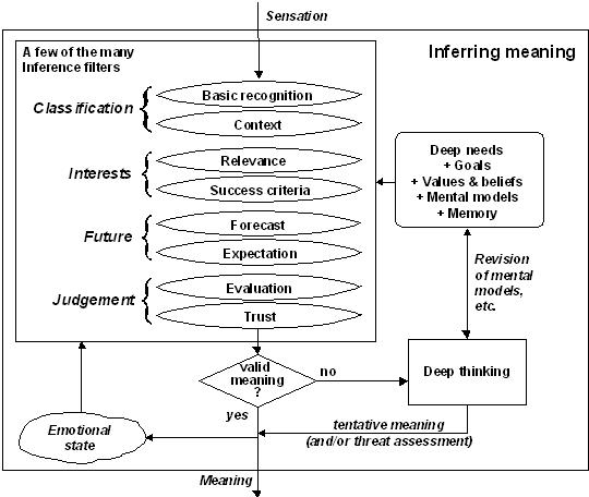 Fig. 9.3 Inferring meaning Basic recognitionThe first thing that we do when receiving an input from our senses is to break it up into pieces that we can classify according to the patterns we have stored in our memories, either by direct recognition (‘That is a hat’) or by taking an educated guess (‘That looks like a hat’). In the rare occasions when we cannot even approximate a classification we might dismiss the perception (using the relevance filter), invent a new classification (for which we may need more data) or be worried by the threat that it might pose to us (using the forecasting filter -- see below). The context filterImagine someone pointing a knife at you. How do you interpret that? If it’s a dark night and you are in a shady part of town, then it will have a different meaning from if you are in the kitchen and a member of the family is handing you the butter knife. The surrounding context in which events happen has a significant effect on how we interpret those events. It is thus a good idea when you want to invent something to go somewhere where the surroundings make you feel creative. The work context often puts people into a state of unquestioning compliance, which is not what you need when you want to be creative, so going off-site and wearing informal clothes can be surprisingly helpful. Another way of being creative using context is to remove the item being investigated from its context and ask, ‘What if this was used elsewhere.’ Imagine taking a vehicle jack and putting it under a subsiding house: as the house leans, you could compensate with a simple adjustment of the jack. Take a razor away from your face and you have a new wood plane or potato peeler.