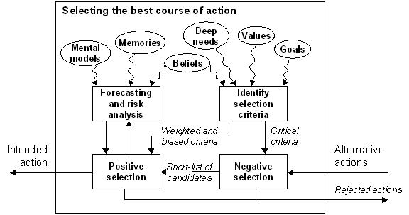 Fig. 9.6 Selecting the best course of action Selection criteriaSelection is done through the application of some form of criteria, which may be consciously or subconsciously selected. These are reasons for or against taking the action, which will allow us to weigh up the pros and cons or the return on investment for each alternative. Negative criteria, which give reasons not to select an alternative, may include costs, risks, difficulty, hassle and trouble. Positive criteria, which highlight the benefits that an alternative might offer, include whether goals will be met, how well they might be met, plus ease and speed of implementation. We tend to use many criteria based on deep needs and personality factors, for example extraverts may seek attention and risk whilst introverts will seek safety. Our values also lend key criteria that will help us decide what is right and wrong. Criteria may also be prioritised, for example cost may be all-important whilst time is a more negotiable element. Although we do not do mathematical weighting in our heads, we will usually lean towards some criteria rather than others. It is important to pay close attention to criteria when selecting creative alternatives, ensuring that personal biases do not lead to potentially useful ideas being rejected. Initial negative selectionRemember when you last bought or rented a home. What you probably did was to go along to a number of housing agents and come away with piles of home details, then start your selection by sorting out the definite ‘no good,’ the ‘maybe’ and the ‘interesting’ homes. The initial strategy that we commonly use when faced with a lot of choices is to ‘sort the wheat from the chaff,’ rapidly eliminating those items we do not want, rather than looking closely at those which we might select. The negative criteria that we use clearly define the boundary of the problem in terms of our primary constraints. We reject houses because we definitely do not want to live in that area or cannot afford that amount of money. In creative situations, the danger here is of rejecting ideas that could be developed into useful solutions. We can use our creative skills to look carefully at these criteria, making them explicit and questioning why we chose them and how we might look at them in other ways. Thus we might consider alternative forms of finance, such as leasing options or sub-letting. ForecastingA key technique for selecting the best course of action is to project the alternatives we are considering into the future to see what might happen if we implement each of these ideas. In forecasting we make much use of our mental models to help us grope forwards, weighing up the implications of each alternative, estimating both the possible outcomes and how likely each one is. We can then choose the most desirable future that will best move us towards achieving our goals. It is a testament to the power of human mind that we do this complex projection in the twinkling of an eye, whilst it still takes supercomputers many hours to calculate the weather. Sometimes, when being creative and inventing things, it is our inability to see the possible futures that becomes the stumbling block that obstructs effective progress. The cause of this may well be our limited mental models about the world. It may also be due to the forecasting process, and in particular how we hurry through this stage, considering too few and too obvious futures. Final positive selectionThe final selection of the alternative that we will implement uses criteria in a more positive way, seeking to narrow down the short-list to the item we will actually implement. This process is not always cool and rational, and even after a long and drawn-out selection process, we sometimes change our minds for no apparent purpose, probably because our subconscious either objects in some way to the selection or prefers another idea that has already been logically eliminated.